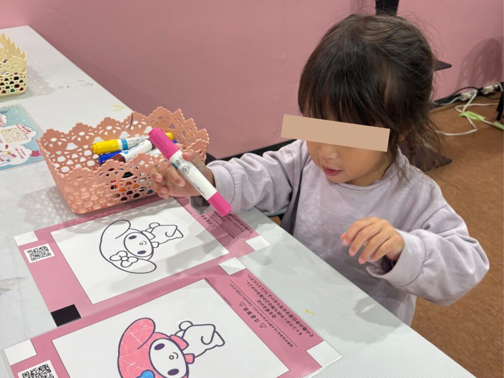 キティ・シナモン・マイメロ・プリンなどのキャラクターから好きなのを1つ選んで、指定の紙に色を塗ったら、その絵が缶バッチになるというものです。