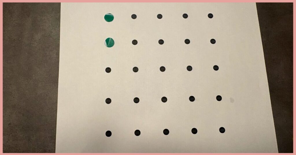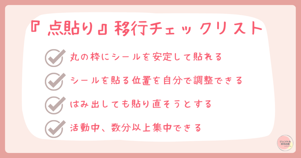 丸枠へのシール貼りを進めていく上で、以下がほぼ毎回できるようになったら、点貼りへ進める目安です。