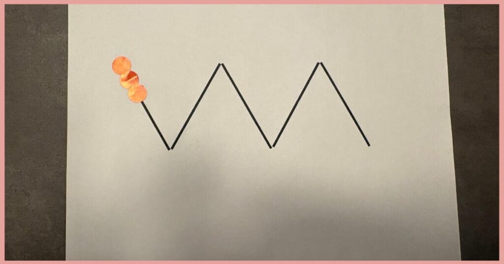 もちろん、丸シールを貼らせ続けても良いのですが、発達段階を見極めて、丸→点→線と難易度をあげていくと、”なぞり・書く”がスムーズになります。