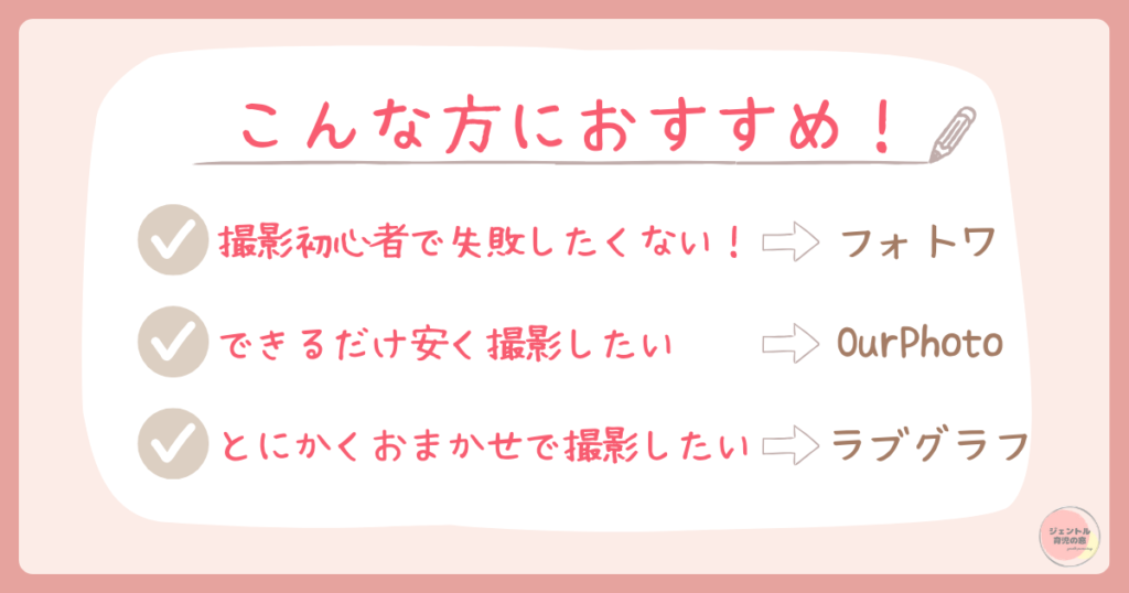 実際の撮影実績を見て『この雰囲気が好きだな』と思える方を選びましょう。