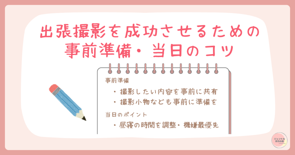 出張撮影を成功させるためには、事前準備や当日も子どもの機嫌最優先でスケジューリングを組むことがカギになります。
