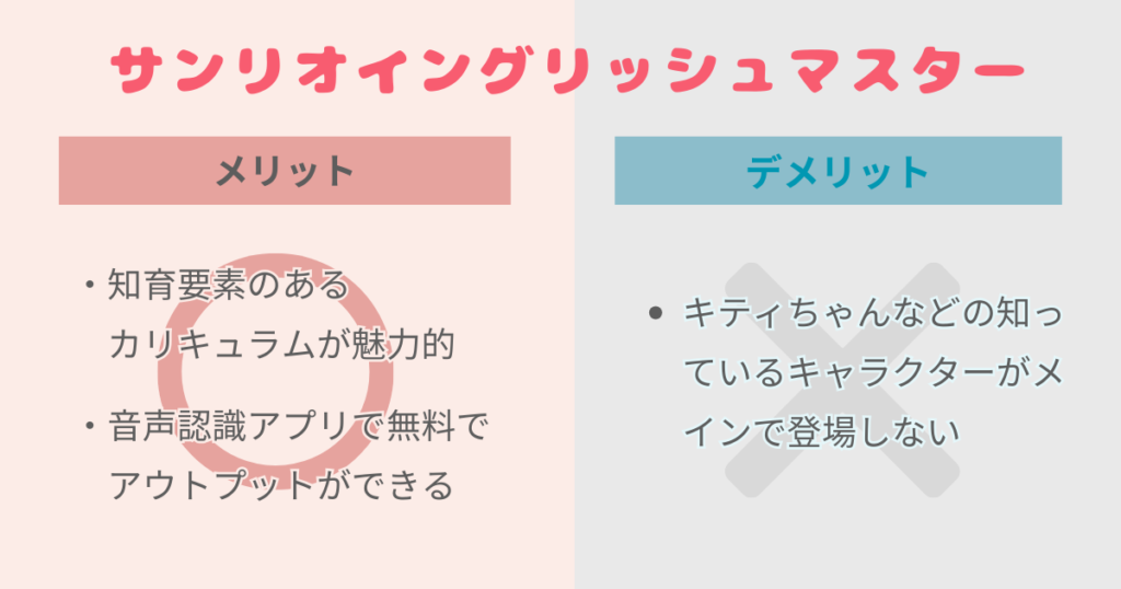 サンリオイングリッシュマスターの教材を真剣検討した上で感じたメリットとデメリットはこちらです。
