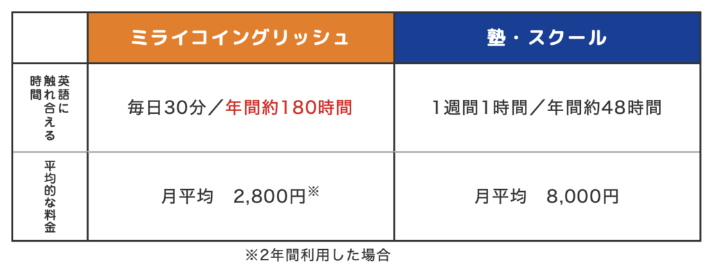 | ミライコイングリッシュ | とにかく安く始めてみたい家庭向け |