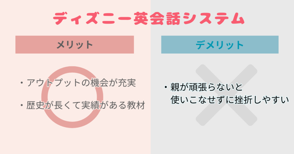 ディズニー英会話システムの教材を真剣検討した上で感じたメリットとデメリットはこちらです。