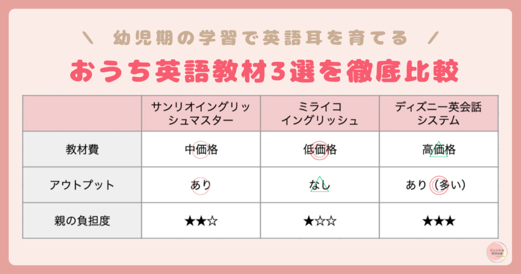 我が家は、サンリオ英語があっていましたが、他の英語教材が合う方もいるので、ぜひ、この記事を見て比較検討してみてください!